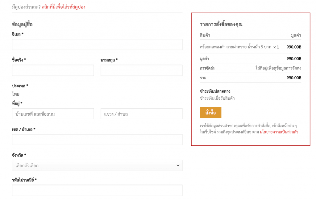 กรอกข้อมูล ชื่อ/ที่อยู่ ที่ต้องการใช้จัดส่ง แล้วเลือกช่องทางการชำระเงินเสร็จแล้วกดที่ปุ่ม “สั่งซื้อ”